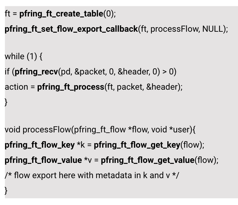 在PF_RING™FT之上设计和实现流处理应用程序非常简单,因为它提供了清晰的API,可用于在几行代码中完成复杂的工作。以下代码段显示了如何使用PF_RING™FT轻松捕获流量并导出流信息。有关完整的代码示例,请查看PF_RING™中可用的演示应用程序。